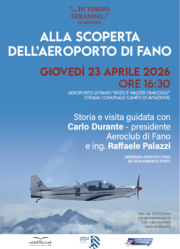 Passione per il volo, maestria tecnica, storia dell’aviazione in una prospettiva inedita per valorizzare un luogo iconico del patrimonio infrastrutturale del nostro territorio: il secondo appuntamento della terza edizione della rassegna culturale “… Di Torno Girando…”, promossa dall’Ente Olivieri – Biblioteca e Musei Oliveriani in collaborazione con Ordine degli Ingegneri della Provincia di Pesaro e Urbino, fa tappa all’Aeroporto di Fano “Enzo e Walter Omiccioli”. L’appuntamento, in programma per giovedì 23 aprile 2026 alle ore 16:30, propone un incontro dal titolo “Alla scoperta dell’Aeroporto di Fano”, ospitato dall’Aeroclub Fano. L’evento non sarà una semplice conferenza ma un viaggio multidisciplinare tra storia e tecnologia, nel corso del quale verranno affrontati molteplici argomenti: dalla genesi centenaria dello scalo alla moderna concezione del volo, fino alla storia dell’aeroporto, i trucchi di gara e la pianificazione del volo. Ciceroni di questo coinvolgente itinerario saranno esperti e professionisti del settore, tra cui il Presidente dell’Aero Club, Carlo Durante, l’Ing. Raffaele Palazzi e Franco Angelotti. Non solo: al termine della conferenza è prevista una breve visita agli hangar, per osservare da vicino i velivoli e scoprire i segreti dell’aerodinamica; in conclusione, un confronto diretto tra relatori e pubblico.